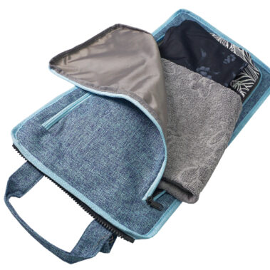 Im Inneren bietet die Tasche einen Zwei-Wege-Zipp, damit deine Kleidung bzw. Handtuch hygienisch von der Yogamatte getrennt ist. Des Weiteren gibt es noch ein Visitkarten-Fach, damit deine Yogatasche nicht verloren geht. Mit dabei ist auch ein stabiler Trageriemen und eine gepolsterte Auflage mit Yoga Air Schriftzug. Diese kannst du mit dem Klettverschluss entweder auf den Trageriemen oder auf die Tragegriffe der Tasche geben.